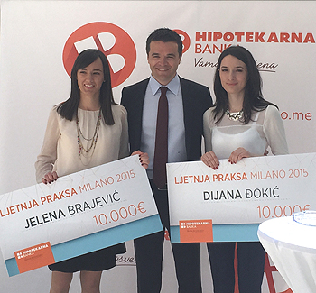 Hipotekarna banka dodijelila dvije stipendije od po 10.000 eura za ljetnju praksu u Milanu, Dijani Đokić, studentu Ekonomskog fakulteta Univerziteta Crne Gore i Jeleni Brajević, studentu Fakulteta za međunarodnu ekonomiju, finansije i biznis Univerziteta Donja Gorica.