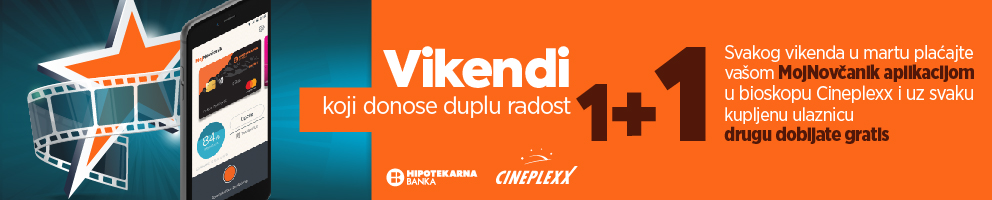 Svakog vikenda u mjesecu martu i aprilu, u bioskopu Cineplexx plaćajte uz pomoć aplikacije MojNovčanik i uz kupljenu jednu bioskopsku kartu dobijate drugu kartu GRATIS.